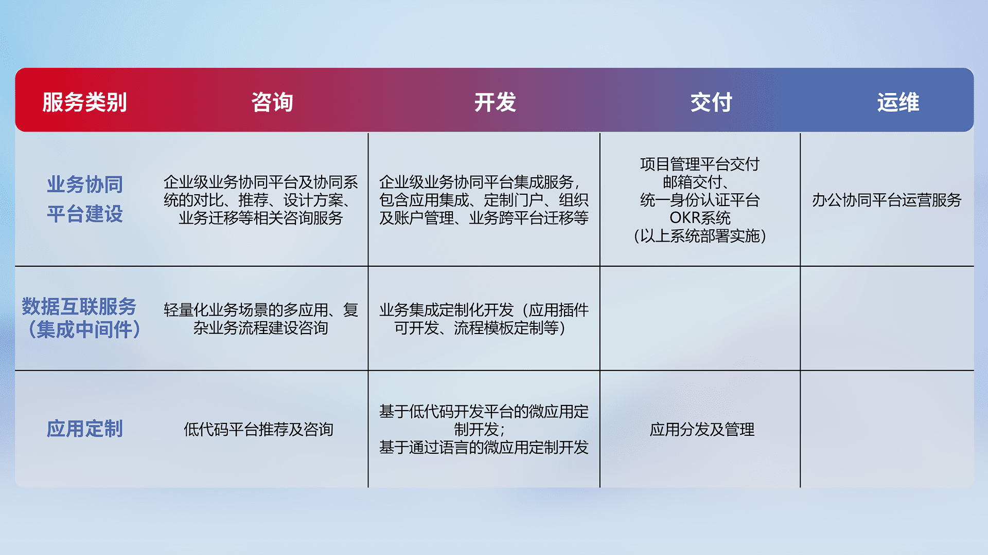 针对钉钉、、、、企微、、、、IDaas等平台级产品提供产品的规划、、、方案、、、、交付、、、、定制化开发等服务,,,,实现如统一协同办公、、、智能客户服务、、混合会议管理、、、、智能数据查询、、、、等业务场景,,实现数字化转型。。。。