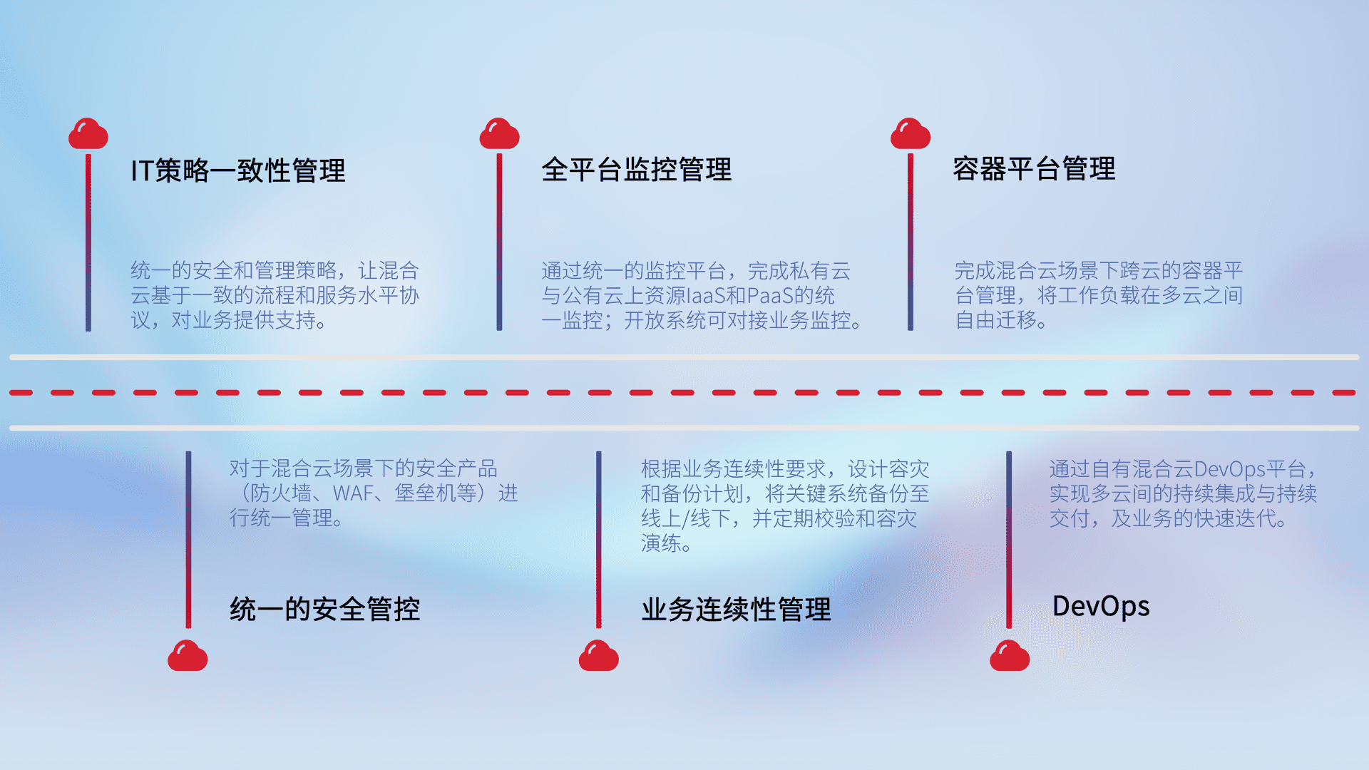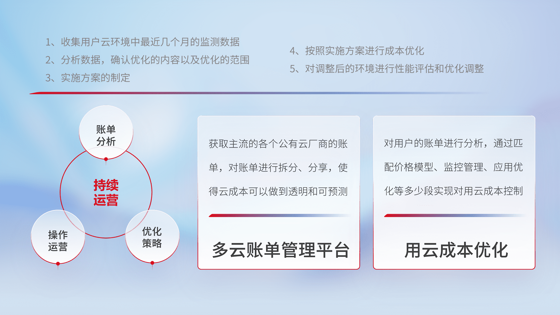 通过多云纳管,,以统一的资源数据模型把客户的云资源进行抽象和封装,,,进而实现对多云资源的统一操作,,,,保障云资源管理的可靠性、、、稳定性与可用性。。。量身定制化运维内容,,配置、、、、开发运维、、、补丁管理、、、备份、、、、监控、、、、认证和访问管理、、审计和日常巡检等,,,保障在用云过程中的可靠度,,稳定度以及高可用率。。